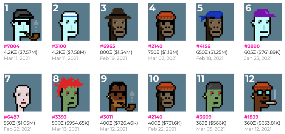 和NFT相关的代币几乎飞涨,Elon Musk也多次发布相关Twitter,而CryptoPunks项目中一张 24x24 像素的头像最高可以卖到4200个ETH,按照当前以太坊价格总价值约760万美金。
